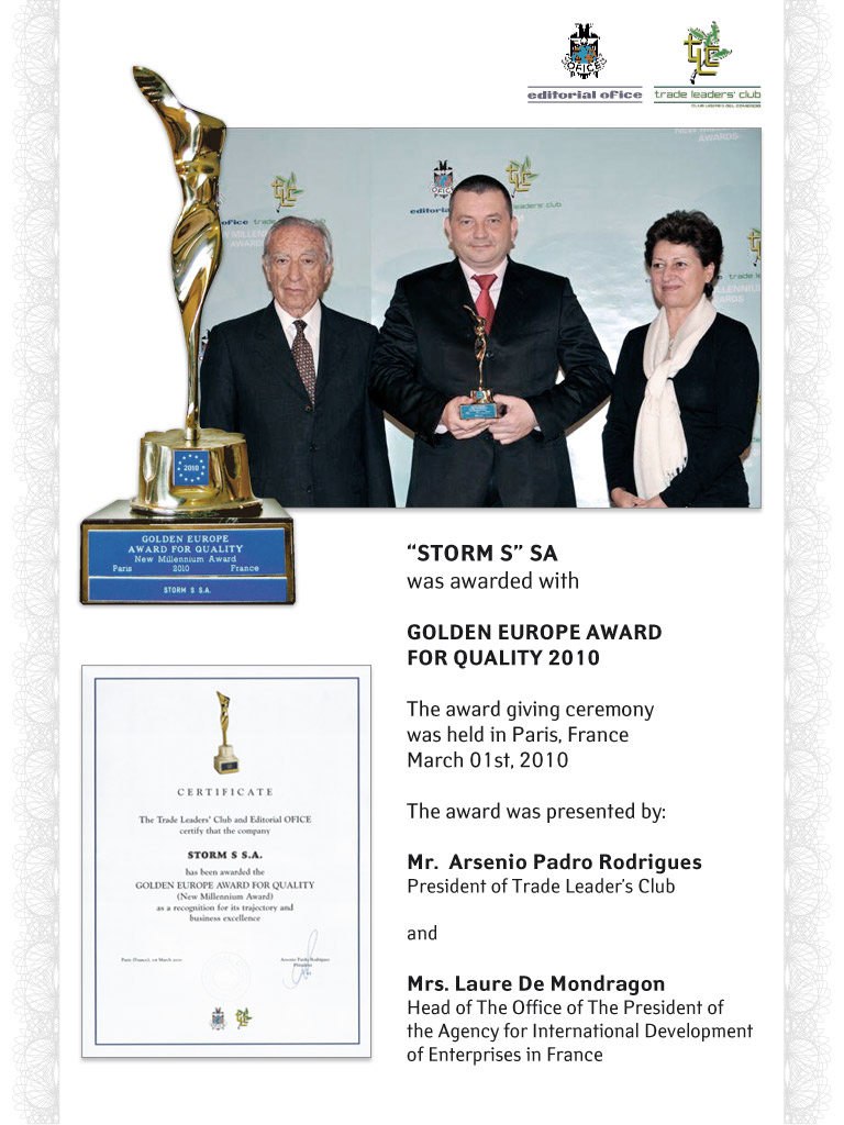 αζλεϊ ξεφψιδ δΰιλεϊιιν, ωιθεϊ δςαεγδ εδθλπεμεβιδ ωμδ, ζλϊδ STORM ατψρ διεχψϊι Golden Europe Award for Quality μωπϊ 2010.
